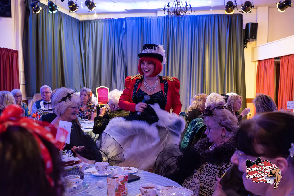 In January 2024, I created a wonderful community group called The Dickie Bows and Petticoats Club. A daytime cabaret club for sassy seniors and friends. The idea came to me after many years of performing in my vintage persona for all kinds of organisations and homes where our ‘golden’ community are, and realising that even they enjoy some very cheeky entertainment. The other side to my life is in the cabaret world – essentially, entertainment for adults with risque shows that include burlesque, drag and circus. So The Dickie Bows and Petticoats Club is essentially a mash up of the two worlds, with a low cost ticket, subsidised by fundraising, and entirely run with volunteers (including myself). A night out in the daytime for our older generation looking for something more than just a natter over a cup of tea. There’s a show (yes, with burlesque, drag and circus), a game of Bingo, afternoon tea from 19fourteas tearoom, and plenty of sing-a-long and laughs.